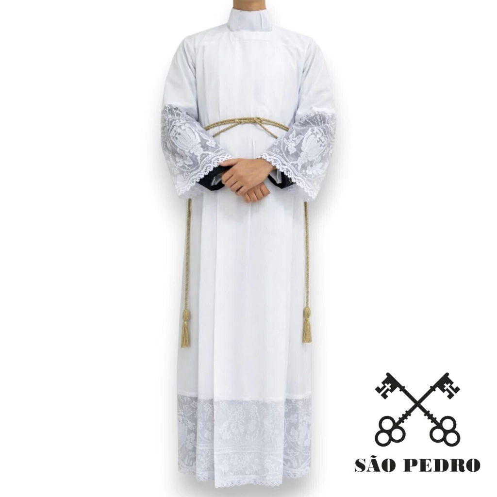 Confeccionado em tecido gabardine, com renda litúrgica de cálice.