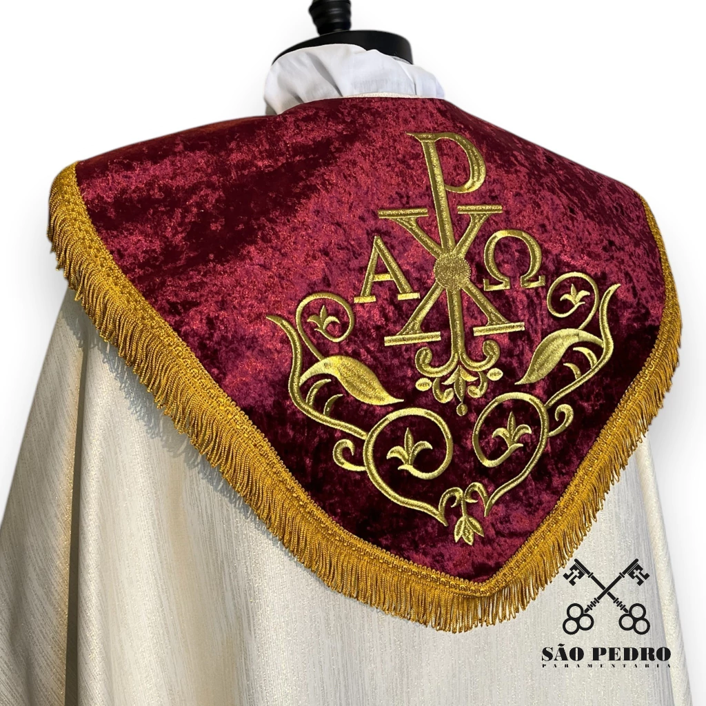- Capa confeccionada em tecido havena, galão e capuz em veludo bordado com fios metalizados.
