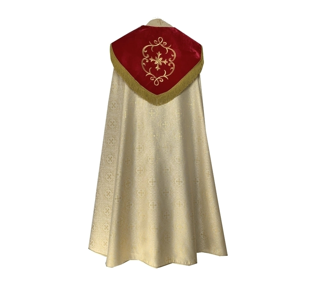 - Capa corte gótico, confeccionada em tecido damasco, galão e capuz em veludo bordado com fios metalizados.