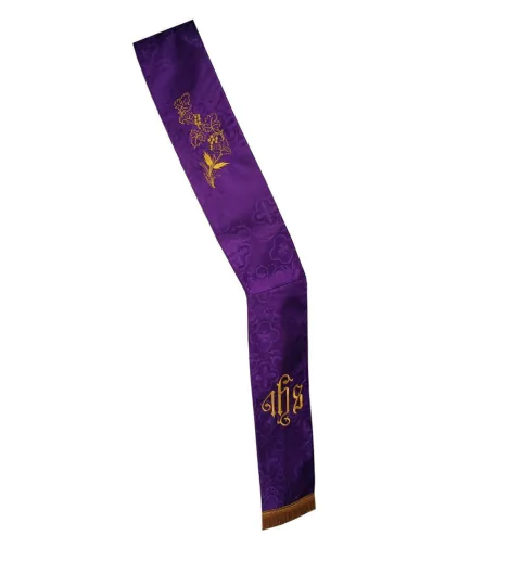 CONFECCIONADA EM TECIDO DAMASCO LITÚRGICO, COM BORDADO DOURADO.