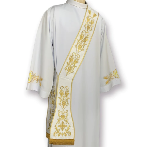 Estola diaconal corte romano em tecido damasco com bordados dourados.